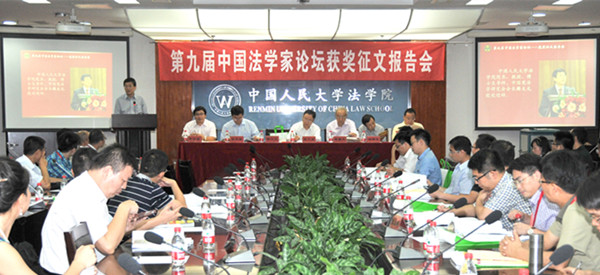 2014年9月3日晚上7:00,第九届中国法学家论坛获奖征文报告会在中国人民大学明德法学楼601国家学术报告厅举行。会议由中国法学会主办,中国人民大学法学院协办。中国法学会党组成员、副会长、学术委员会主任张文显教授出席论坛并讲话。中国人民大学法学院院长、中国宪法学研究会会长韩大元教授发表了热情洋溢的欢迎辞。来自全国各地的第九届中国法学家论坛征文活动获奖作者和优秀组织单位的代表、中国人民大学法学院部分师生等共100余人参加了报告会。开幕式由中国法学会研究部主任李仕春教授主持。
