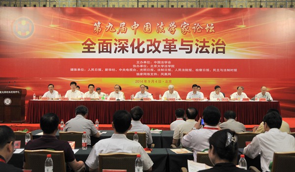 9月4日,第九届中国法学家论坛在北京大学隆重举行。中国法学会会长王乐泉出席并作重要讲话。他强调,广大法学法律工作者要正确认识改革与法治的关系,坚定“三个自信”,积极建言献策,为繁荣法学理论、全面深化改革、推进法治中国建设贡献智慧和力量。第九届全国政协副主席罗豪才出席论坛。中国法学会党组书记、常务副会长陈冀平主持开幕式并在闭幕式上作总结讲话。