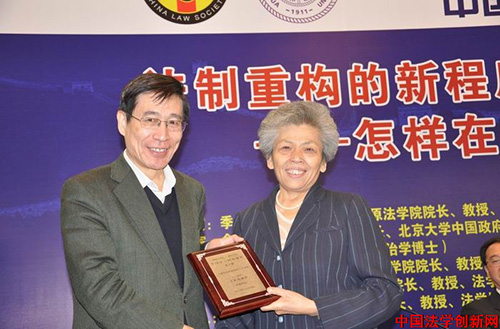 中国法学会党组书记刘飏常务副会长为评论嘉宾俞可平教授颁发“演讲纪念牌”