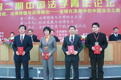 下面进行第二个程序,颁发论坛报告人荣誉证书。第2期中国法学青年论坛组委会于2010年1月6日发布征集论文的公告,并组成了以中国政法大学黄进教授为主任的论文评审委员会。截止3月21日共收到论文80余篇,其中符合条件的77篇,作者分别来自全国51家法学科研单位。3月21日下午,按照公开、公正、公平的原则,采取匿名评审办法,经过认真的评审,评审委员会最后确定了12篇论文作为本期论坛报告的论文。这12篇论文的作者是西南政法大学范雪飞、北京大学郭雳、中国政法大学韩春晖、中国政法大学李怀胜、宜宾学院雷安军、清华大学马剑银、中国人民大学王建学、西北政法大学邱昭继、中国青年政治学院王莉君、上海交通大学魏磊杰、澳门科技大学谢耿亮、中国人民大学杨东。
