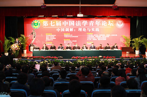 12月22日,由中央政法委员会、最高人民法院、最高人民检察院、共青团中央作为指导单位,中国法学会主办,西南政法大学和中国法学会法律信息部共同承办的第七届中国法学青年论坛,在西南政法大学隆重举行。中国法学会副会长李清林、最高人民法院副院长江必新、最高人民检察院检委会副部级专职委员童建明、重庆市高级人民法院院长钱锋、中央政法委综治二室主任陈显辉等出席论坛并讲话。论坛主题为“中国调解:理论与实践”。通过全国征文活动遴选产生的12位青年法学法律工作者,与中央政法委、全国人大法工委、最高人民法院、最高人民检察院、司法部、中国法学会以及北京大学、清华大学、中国人民大学等高校的知名专家学者,针对“调解的一般理论和大调解机制”、“法院调解和人民调解”、“刑事和解、行政诉讼和解和劳动争议调解”等三个专题进行了热烈深入的交流和讨论。论坛指导单位、协办单位的领导、来自法学理论和实践部门的专家学者、重庆市法学、法律工作者代表和西南政法大学的师生近400人参加了论坛。