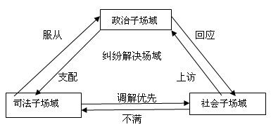 其次是如何界定“调解优先”,又该如何在当代中国司法的政法大背景下理解这一“调解优先”。在中国当代的纠纷解决场域中,政治、司法和社会三个子场域之间存在一种不满与回应、支配和服从之间的动态复杂关联。以下是一个纠纷解决三场域之间复杂且动态的关系示意图。