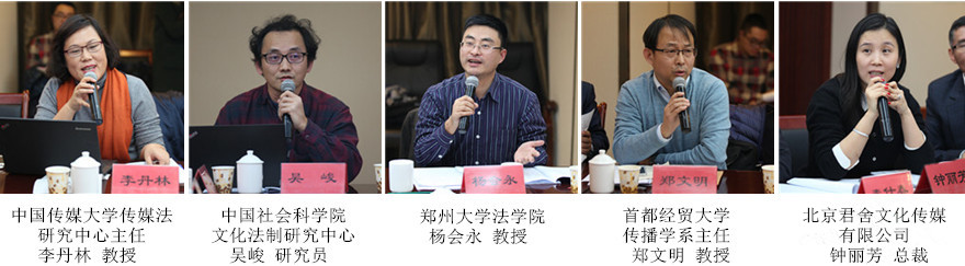 第九届、十届、十一届全国政协委员、中国电影家协会副主席、中国电影文学学会王兴东会长,中国社会科学院文化法制研究中心常务副主任陈欣新研究员,中国传媒大学文法学部副部长王四新教授,中国社会科学院文化法制研究中心副主任兼秘书长陈根发研究员,中国法学会行政法学研究会常务理事、中央民族大学法学院熊文钊教授,中国法学会知识产权法学研究会常务理事、中国人民大学知识产权学院李琛教授,中国社会科学院法学研究所邓子滨研究员,中国社会科学院文化研究中心副主任贾旭东研究员,中国传媒大学传媒法研究中心主任李丹林教授,中国社会科学院文化法制研究中心吴峻研究员,郑州大学法学院杨会永教授,首都经贸大学传播学系主任郑文明教授,北京君舍文化传媒有限公司总裁、中国百老汇娱乐控股有限公司董事长、北京小马奔腾股份有限公司董事钟丽芳,华人全球影业集团李新董事长,中国电影家协会新媒体发展工作委员会副秘书长、湖北华语广电传媒有限公司总裁、制片人苗炜基导演,华壹国际影视文化传媒公司刘代军董事长,北京天驰君泰律师事务所合伙人、影视法律事务中心创始合伙人郑小强律师,中国传媒大学凤凰学院副院长司若副教授等参加会议。北京第四中级人民法院程琥副院长,清华大学知识产权法研究中心崔国斌主任提交了书面修改意见。