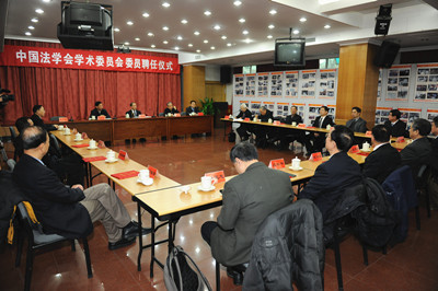 中国法学会副会长张鸣起,新一届学术委员会副主任委员李林,学术委员会委员王利明、王保树、刘春田、孙宪忠、应松年、沈四宝、沈国明、怀效锋、张庆福、赵旭东、胡建淼、莫纪宏、蔡守秋,荣誉委员陈光中,中国法学会机关各部室、各直属单位负责人以及中央新闻媒体同志约50人参加聘任仪式。