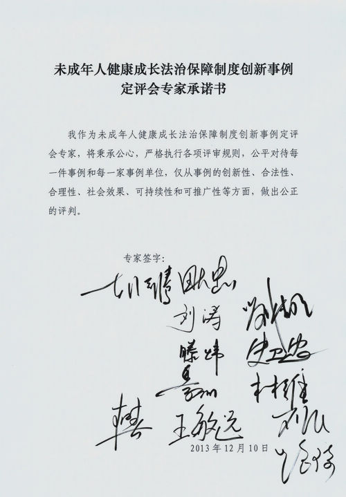 随后,法律信息部吕兴焕副主任和王伟国副主任分别宣读了《未成年人健康成长法治保障制度创新事例定评办法(草案)》和专家承诺书,全体评审专家一致通过了定评办法,并在承诺书上签名。中央综治办田大忠巡视员介绍了专家分组名单和定评细则后,会议进入到评审环节。