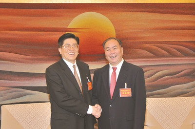 11月30日,中国法学会第七次全国会员代表大会上,新当选的会长王乐泉与第六届中国法学会会长韩杼滨亲切握手。