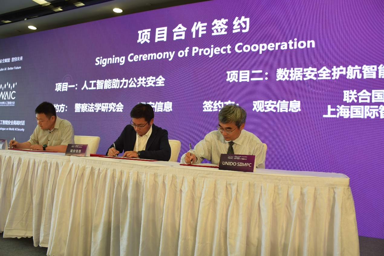 论坛现场同时举行三大项目合作签约。中国法学会警察法学研究会秘书长邢捷、观安信息CTO胡绍勇进行人工智能助力公共安全项目签约,联合国工业发展组织上海国际智能制造促进中心主任吴玉刚、观安信息CTO胡绍勇进行数据安全护航智能制造项目签约,格力电器工艺部部长钟明生、上海控安COO刘毅、科士恩科技CEO胡东明进行多模态协同人工智能工业检测签约。