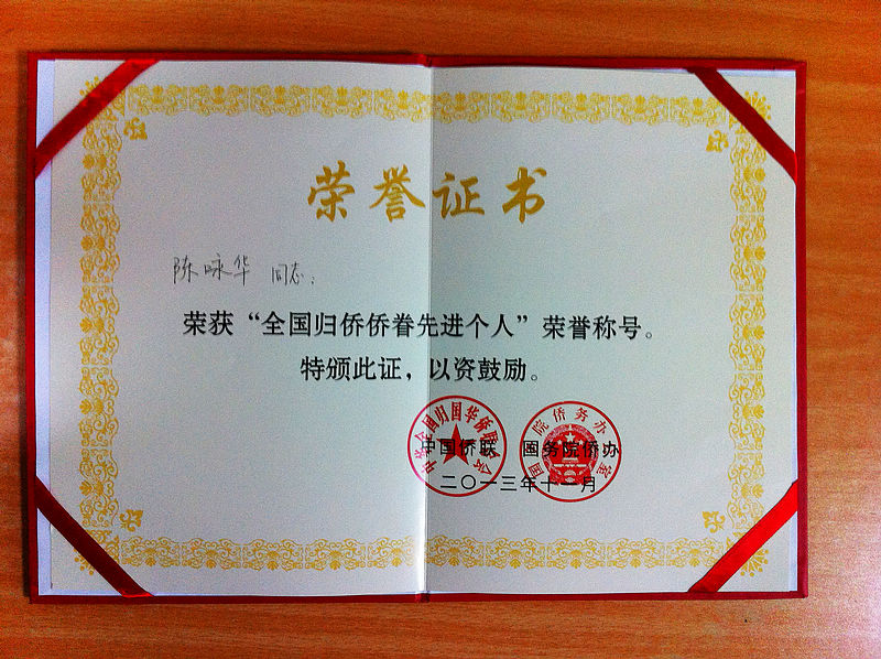 第九次全国归侨侨眷代表大会于2013年12月2日上午在北京人民大会堂开幕,党和国家领导人习近平、李克强、张德江、俞正声、刘云山、王岐山、张高丽等到会祝贺。中共中央政治局委员、国家副主席李源潮受党中央委托,发表了题为《团结动员广大归侨侨眷和海外侨胞为实现中华民族伟大复兴的中国梦作出独特贡献》的祝词。会上表彰了中国侨界杰出人物和全国归侨侨眷先进个人。法律信息部陈咏华同志荣获由中华全国归国华侨联合会和国务院侨务办公室授予的“全国归侨侨眷先进个人”荣誉称号。
