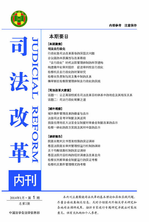 新年伊始,《司法改革内刊》2014年第1期(总第2期)如期推出。本期聚焦“司法去行政化”,选编了最近一段时间来的理论研究与实践探索,旨在为具体落实《中共中央关于全面深化改革若干重大问题的决定》的相关部署提供参考。