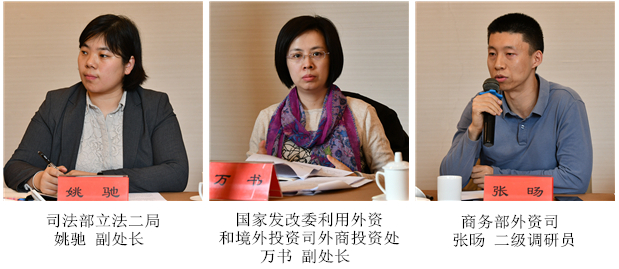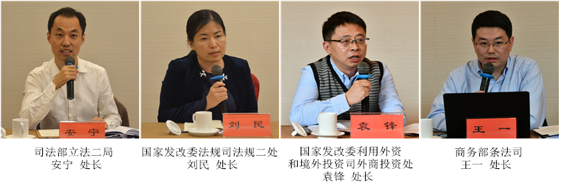 司法部立法二局安宁处长和姚驰副处长,国家发改委法规司法规二处刘民处长、利用外资和境外投资司外商投资处袁锋处长和万书副处长,商务部条法司王一处长和外资司张旸二级调研员参加了研讨会。会议开始后,安宁处长、袁锋处长和王一处长介绍了《外商投资法实施条例(征求意见稿)》的起草背景和主要考虑。
