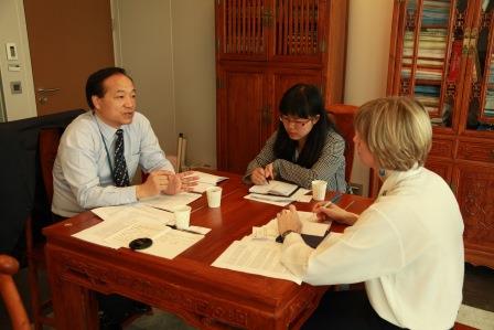 4月28日,交流中心尹宝虎主任应邀与法国驻华使馆法律参赞吕妍婧座谈