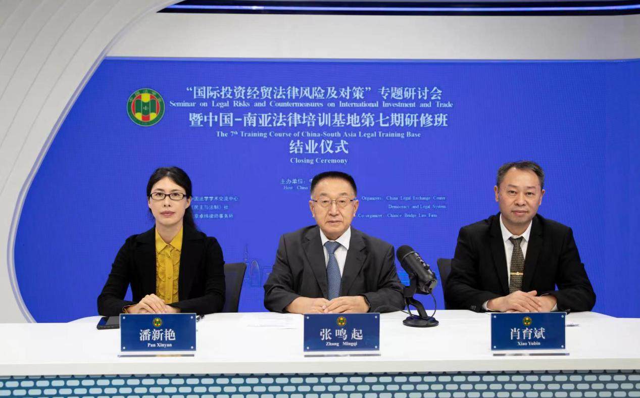 本次研讨会围绕“中国-南亚贸易安全法治保障”和“国际投资治理与争端解决”两个议题开展研讨交流。来自孟加拉国、尼泊尔、巴基斯坦、印度、马尔代夫、斯里兰卡等6个国家的75位政府官员、法官、检察官、律师、学者等参加线上会议。会后举行了“中国-南亚法律培训基地第七期研修班”结业仪式。