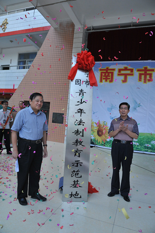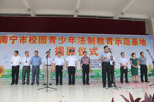 9月23日上午,“南宁市校园青少年法制教育示范基地”在南宁市第二十一中学、市北湖北路学校正式揭牌成立。自治区法学会专职副会长兼秘书长陈锋,市委常委、政法委书记、市法学会会长朱育兆,西乡塘区委书记谭良良以及市中级法院、市检察院、市教育局、市公安局、市司法局、市综治办、市法学会、团市委、西乡塘区各主办单位、各城区政法委、教育局的领导等应邀出席了揭幕仪式。