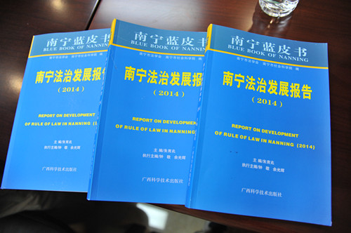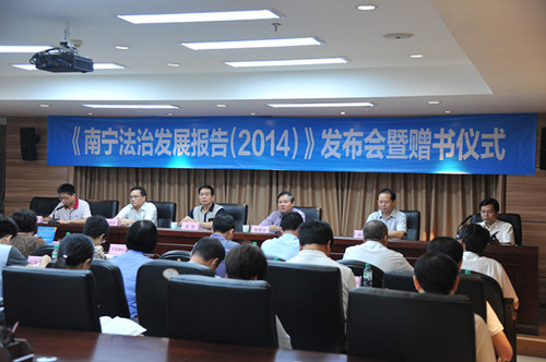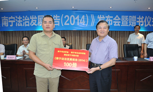 2014年8月13日上午,南宁市法学会、南宁市社会科学院共同(编著)完成法治蓝皮书《南宁法治发展报告(2014)》的发布会暨赠书仪式在南宁市举行。南宁市委常委、政法委书记、市法学会会长朱育兆,广西法学会专职副会长兼秘书长陈锋等同志出席发布会并向各有关单位赠书。