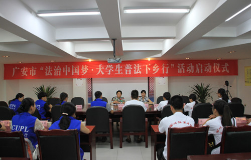 7月14日下午,广安市法学会联合市司法局、团市委共同举行了广安市“法治中国梦•大学生普法下乡行”活动启动仪式。市法学会专职副会长梁宁川、团市委副书记陈欣、市司法局副局长舒翠华出席启动仪式,来自中国政法大学和西北政法大学的19名大学生参加了启动仪式。
