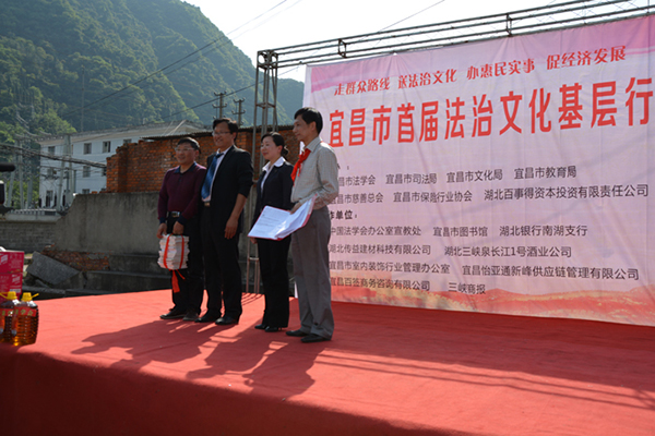 此次活动由宜昌市法学会、司法局、文化局、教育局、保险行业协会、湖北百事得资本有限责任公司、市慈善总会等单位共同主办。首站活动在浓浓的法治文化氛围中开幕,一幅幅法治文化书法摄影作品布满现场四周,一张张法律、科技咨询台排列会场两侧,一个个以相关法律为内容编创的文艺节目吸引了近千群众的驻足观看。活动中,以文艺演出为主线,开展了法律知识问答,农民法律需求问卷调查,专题法律宣讲,法律、科技书籍及资料赠送,同时为两家新获“中国法学团体会员单位”资格的单位授予了匾牌。