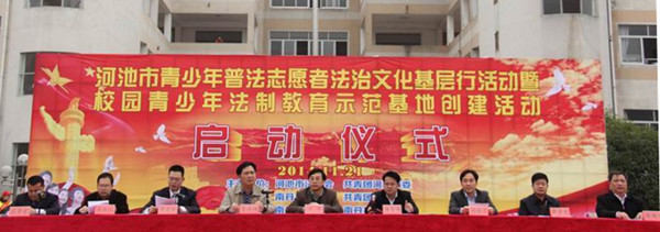 启动仪式由市委政法委副书记、市法学会常务副会长覃星强主持,河池市委常委、政法委书记、市法学会会长潘育伟作重要讲话,中共南丹县委书记莫振祖在会上致辞。会议宣布南丹县高级中学、南丹县中学、南丹县第一小学为首批“河池市校园青少年法制教育示范基地”并授予牌匾,在启动仪式上,自治区、市委、县委领导还庄严地给南丹县青年普法志愿者代表授旗。