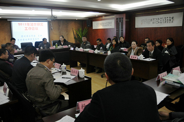 2014年12月26日,贵州省法学召开了法学研究工作会议。省社会科学院院长、省法学会学术委员会主任吴大华,省政府法制办副主任、省法学会副会长、省法学会行政法学研究会会长舒葳韧,省法学会副会长兼秘书长徐文山,贵州师范大学副校长、省法学会学术委员会委员徐晓光,省法学会学术委员会部分学术委员,各研究会负责人出席了会议。西南政法大学教授、博士生导师,重庆市市场交易法律制度研究基地常务副主任,中国市场经济法治研究中心副主任,中国不动产研究中心主任,重庆市民法经济法研究会副会长,澳门科技大学讲座教授刘云生和云南民族大学教授、台湾中央研究院民族学所博士后郭锐应邀到会指导。