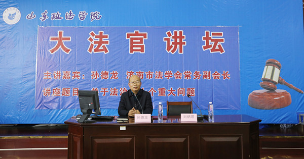 5月7日,应山东政法学院邀请,济南市法学会常务副会长兼秘书长、济南市法学会巡回法治报告团副团长孙德龙同志在该校“大法官讲坛”为300余名在校优秀大学生作了《关于法治的十个重大问题》的法治报告。山东政法学院刑事司法学院院长、济南市法学会副会长刘炳君教授主持报告会。