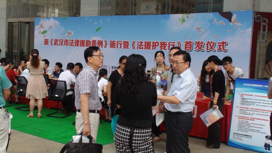 2015年6月1日,新《武汉市法律援助条例》正式颁布施行。为广泛宣传新《武汉市法律援助条例》,让更多市民群众知晓受益,当日上午,武汉市洪山区法学会、区司法局联合在洪山区珞珈创意体验城大门前,举办新《武汉市法律援助条例》颁布施行暨《法援护我行》首发仪式,这也是武汉市青年普法志愿者“法治文化基层行”中的一项重要活动。武汉市人大法规室副主任庞少华,市司法局副局长罗平、法援处、法律援助中心负责人,洪山区人大副主任窦梅,洪山区政府副区长杨海松等领导出席活动,26位普法志愿者及洪山区法学会、区司法局工作人员参与现场法律服务。
