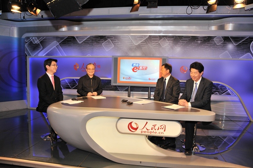 两会前夕,中国法学会党组书记、常务副会长陈冀平(左二)做客“两会e客厅”,与全国政协委员、中华全国律师协会会长王俊峰(右二),中国政法大学教授卞建林(右一)共话全面推进依法治国,访谈由本报记者张洋(左一)主持。