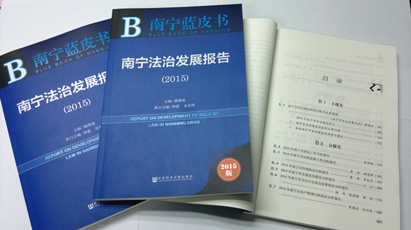 近日,南宁法治蓝皮书——《南宁法治发展报告(2015)》在北京出版发行。该书由社会科学文献出版社出版,南宁市法学会、南宁市社会科学院联合编撰。全书分主报告、分报告和专题报告3个部分,约25万字。