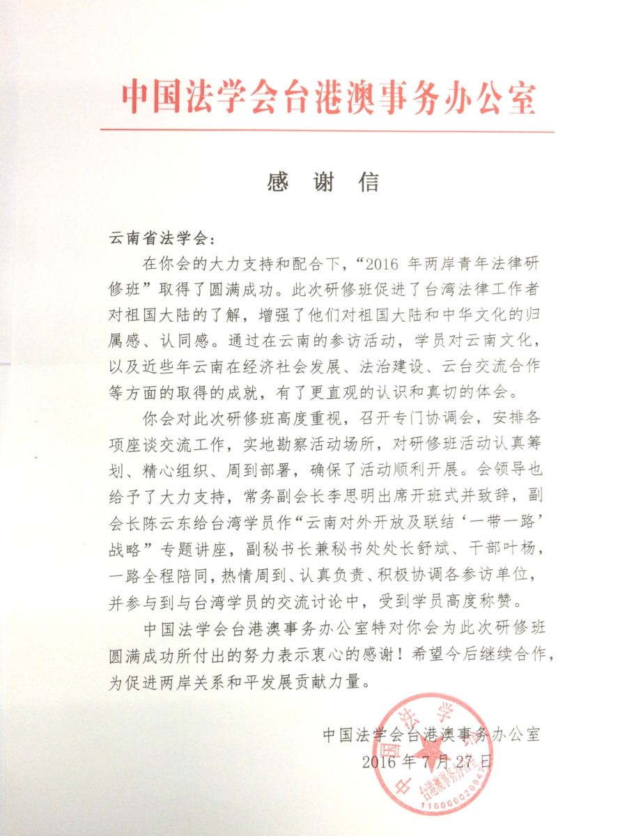 7月7日至13日,由中国法学会主办,云南省法学会承办的“2016年两岸青年法律交流研修班”在云南举行,活动取得了圆满成功。此次活动促进了台湾法律工作者对祖国大陆的了解,增强了他们对祖国大陆和中华文化的归属感、认同感。对云南今年来在经济社会发展、法治建设、云台交流合作等方面的成就有了更直观的认识和真切的体会。中国法学会对省法学会为此次活动圆满成功所做的各项工作给予了充分的肯定,并致函表示感谢。
