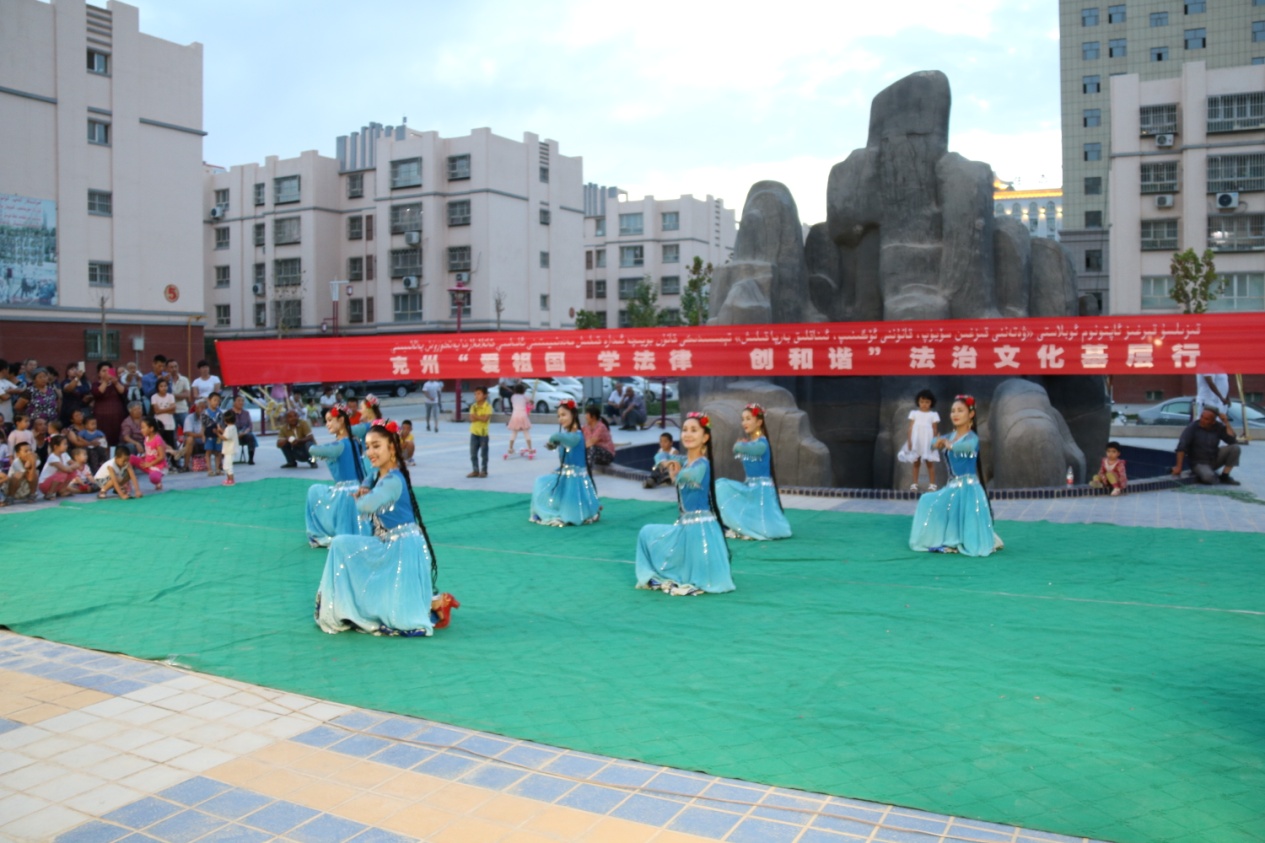 在阿图什市群众路社区,来自市歌舞团的青年普法志愿者,为群众送去以法治宣传、爱国教育、民族团结为内容编排的舞蹈、歌曲等,在歌舞表演的同时,穿插了法律有奖知识问答环节,现场气氛热烈,居民群众参与积极、热情高涨。阿图什市电视台对活动做了专题采访报道。