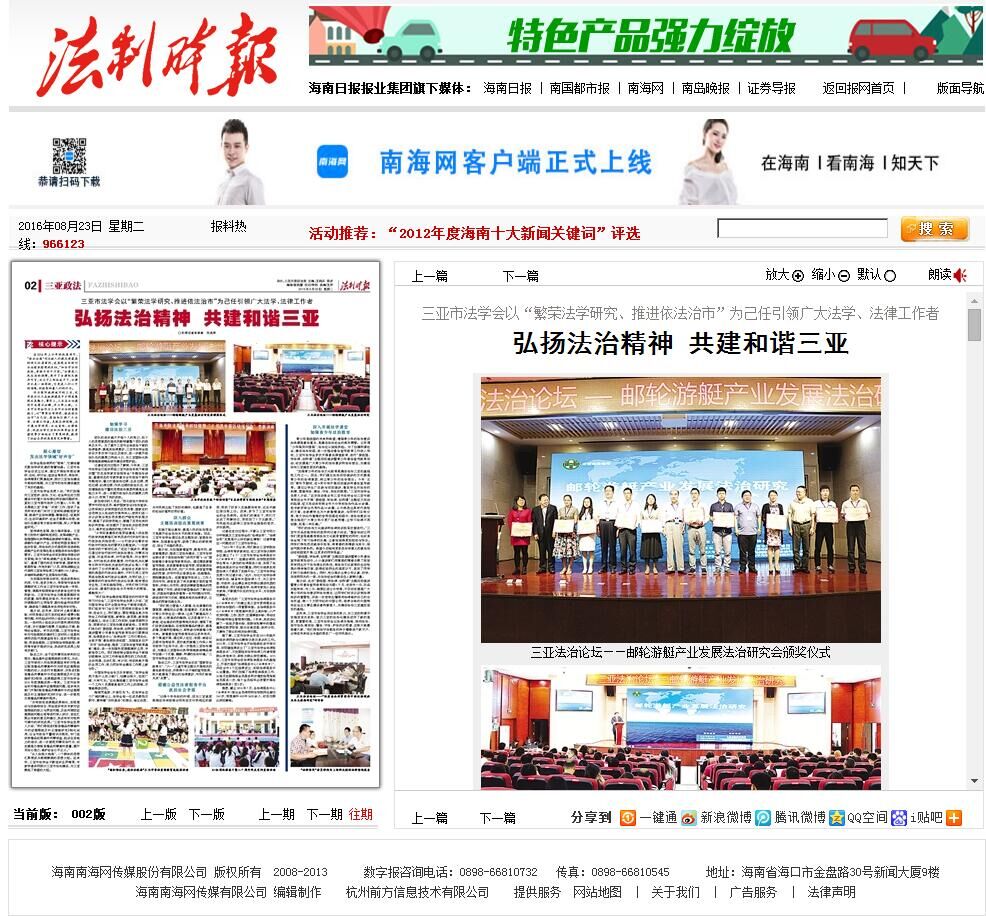 今年来,海南省各市县陆续成立法学会,工作开展需要学习更多的经验和方法,三亚市法学会是海南省成立最早的地级市法学会,自成立以来,在省法学会以及市委政法委的正确领导下,坚持以“繁荣法学研究,推进依法治市”为己任,切实发挥法学理论研究、法律服务、普法宣传等各项职能,服务三亚法治建设。三亚市法学会工作对全省市县法学会有一定的借鉴作用,为此,海南省委政法委主管的《法制时报》第4133期(2016年8月23日)第二版对三亚市法学会工作情况作了整版报导,为全省各市县法学会建设提供学习参考,并建立起互相学习与沟通的桥梁,共同推进海南法治建设的进程。