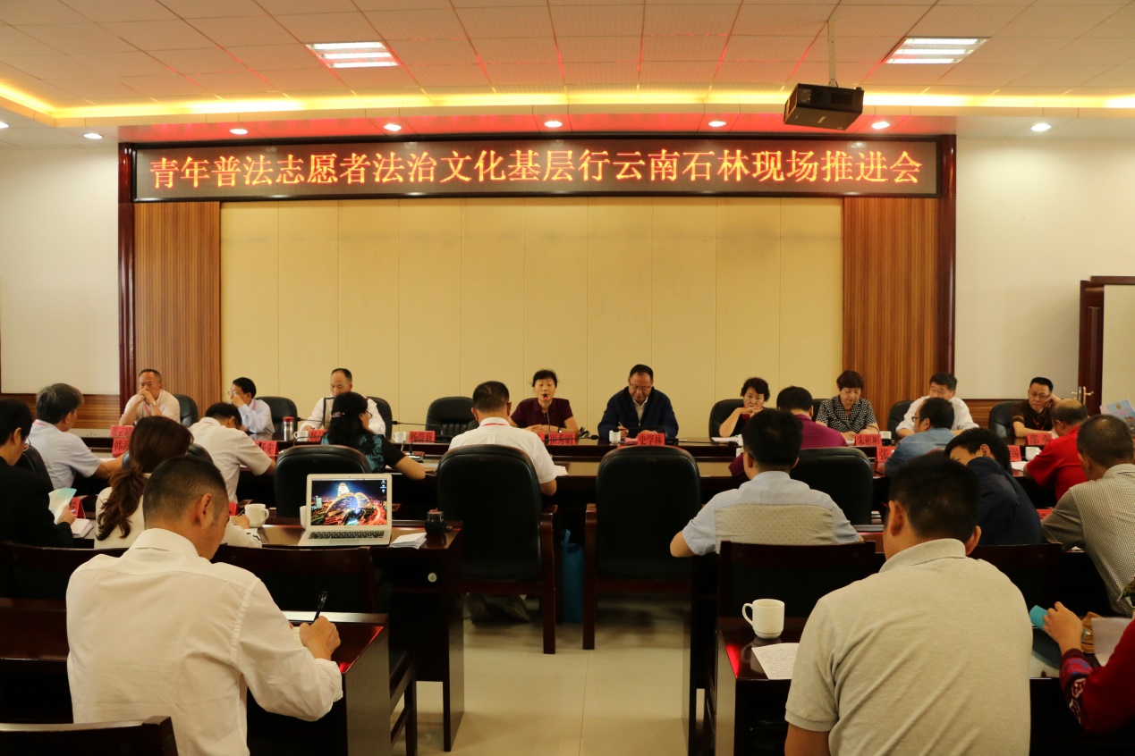 2017年9月27—29日,由云南省法学会、云南省司法厅、共青团云南省委主办,昆明市法学会、石林县法学会承办的2017年“青年普法志愿者法治文化基层行”(以下简称“基层行”活动)云南现场推进会在石林成功举办。中国法学会、司法部、共青团中央、部分重点省市法学会领导、云南省法学会、云南省司法厅、共青团云南省委及云南省内各州市法学会领导约40余名代表参加会议。