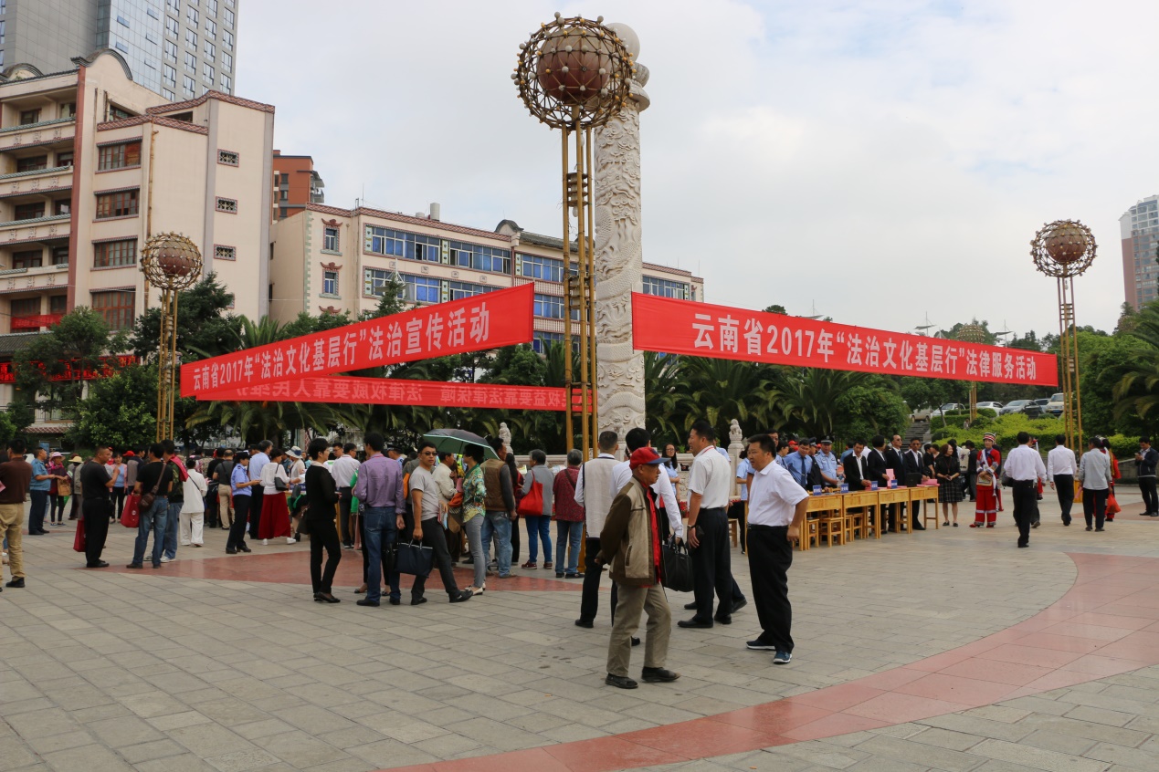 2017年云南省“青年普法志愿者法治文化基层行—昆明•石林”活动,以“爱祖国、学法律、创和谐”为主题,省、市、县三级联动,县级法学会50余家团体会员单位,300余名青年普法志愿者参与,受教育群众3000余人,发放法治宣传资料6000余份。活动通过创新开展“七个一”,即:一堂法治讲座、一次法律服务、一个模拟法庭、一场普法活动、一个法治园区、一个法治基地、一场法治展演,在全社会进一步形成尊法、学法、守法、用法的良好氛围,为党的十九大的胜利召开营造了良好的法治环境。